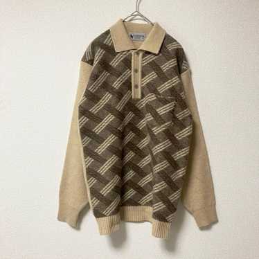 Cashmere Half Button Check Pattern Design Knit Beige Vintage
