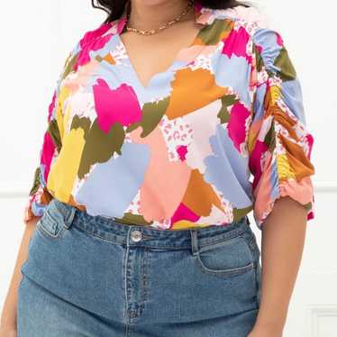 ELOQUII Elements Colorful Abstract Print Top Ruched Sleeves Womens Size 20