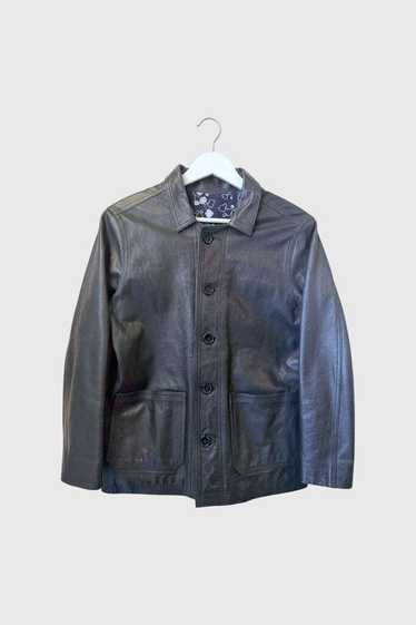 Olive Green Medium Leather Utility Field Jacket Structured Front Button Pockets