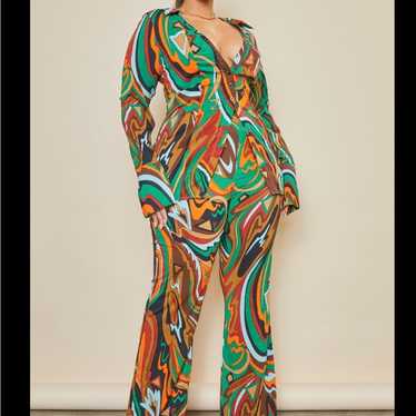[Plt] Abstract Print Plisse Cowl Plunge Maxi Dress